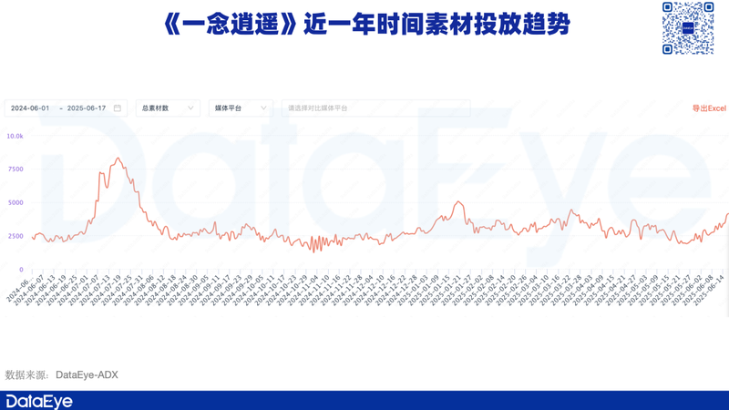 素材投放量相对突出:单日素材投放量超2万组,可见雷霆游戏对于《杖剑传说》的重视程度。此外,《一念逍遥》近期的素材投放量与往年同期相比,有明显的下滑趋势。