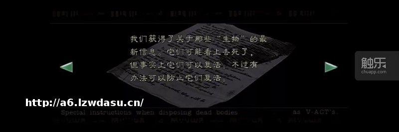宏观上的解谜就是剧情,“生化危机”的故事常常和某些阴谋研究挂钩,玩家要探寻真相,整个游戏进程就是一个巨大的谜题。与这种解谜相伴的,就是“生化”特色的“File系统”,需要玩家通过流程中搜集的信息来获知故事内情,这也是“小**”们较易学到的点。