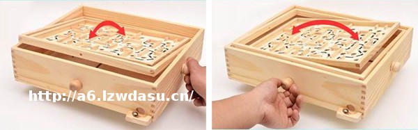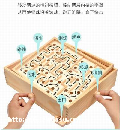 平衡球玩具是由一个木盒中带有两根转动轴的一块迷宫状模板组合而成。孩子需要通过转动盒子两侧的控制旋钮,来控制两层内格的平衡从而使钢珠平稳滚动,避开内格上的一个个洞,让小钢珠一直停留在内格上,最终抵达终点。