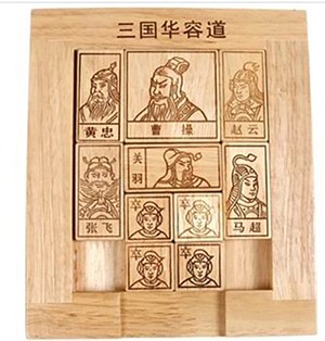 华容道,中国历史上地名。就是“从此道可至华容也”。这里所说的华容,当然是指华容县城。华容道也就是赤壁战争中曹军逃入华容县界后向华容县城逃跑的路线 。故此,华容道这个游戏的最初版本就做成了曹操、关羽、黄忠、赵云、张飞、马超、刘备兵的棋盘。通过移动各个棋子,帮助曹操从初始位置移到棋盘最下方中部,从出口逃走。不允许跨越棋子,还要设法用最少的步数把曹操移到出口。曹操逃出华容道的**障碍是关羽,关羽立马华容道,一夫当关,万夫莫开。关羽与曹操当然是解开这一游戏的关键。四个刘备军兵是最灵活的,也最容易对付,如何发挥他们的作用也要充分考虑周全。