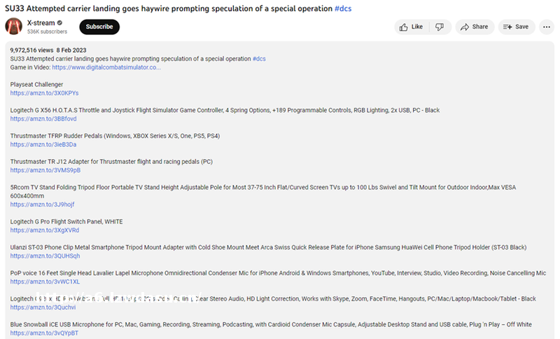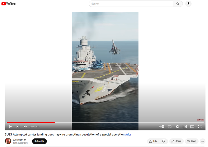 一型单座双发舰载***苏-33航母着陆失败的画面。画面内容来自模拟空战类游戏《数字战斗模拟世界》,并非真实世界。@x-stream还在视频说明中详细罗列了其录制该游戏画面时使用的各项装备及相应参数。