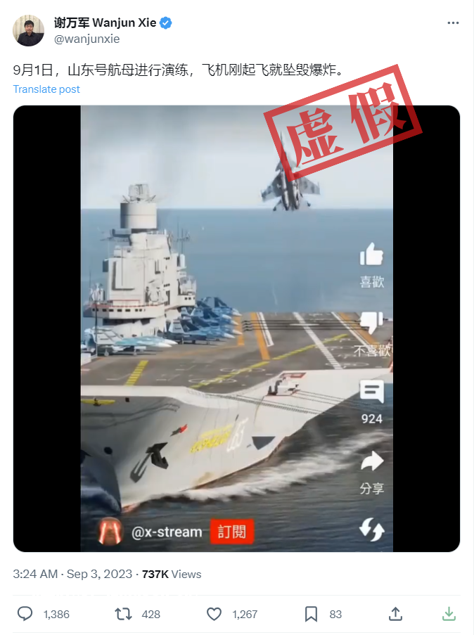 9月3日,推特账号@wanjunxie发布视频称:“9月1日,山东号航母进行演练,飞机刚起飞就坠毁**。”