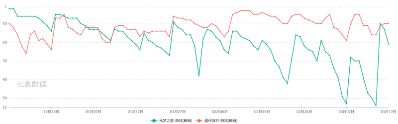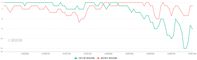 但1月29日《蛋仔派对》实现了短暂反超,而从1月12日开始《元梦之星》在**榜上就一直落后于《蛋仔派对》(马化腾在腾讯年会讲话处于这一时间段),直到3月22日新赛季开启才反超《蛋仔派对》一位且只保持了一天,而在1月12日,也就是大年初一的春节**天开始,被《蛋仔派对》彻底踩在脚下。