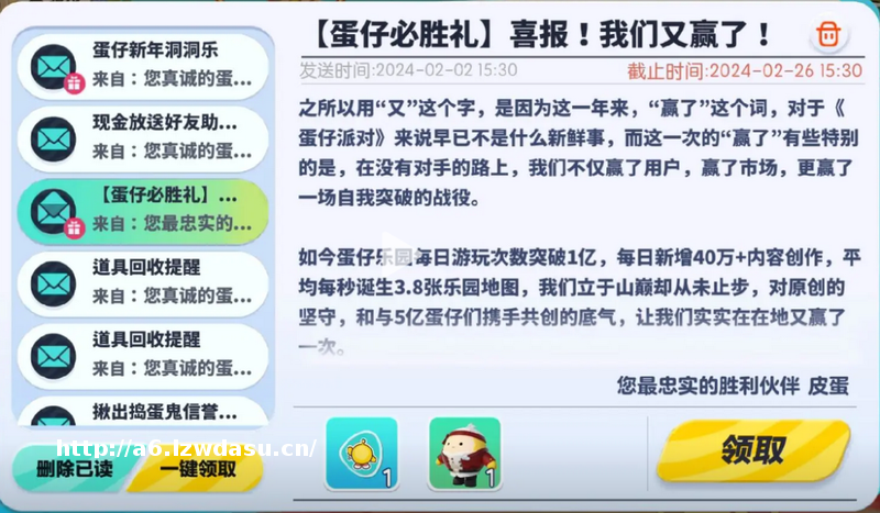 紧接着在2024年2月7日,《蛋仔派对》在游戏中给玩家发送了一封名为【蛋仔必胜礼】的喜报,表示“我们又赢了”,并宣布蛋仔乐园每日游玩次数突破1亿,每日新增40万+内容创作,平均每秒诞生3.8张乐园地图,以及游戏拥有2000万+心怀热爱、志同道合的创作伙伴。