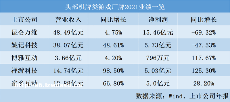 具体来看,5家上市公司中,昆仑万维(300418,SZ)和姚记科技(002605,SZ)两家为A股公司,其余三家为港股公司。其中,昆仑万维、姚记科技2021年在净利润上均出现大幅下降;港股公司禅游科技(2660,HK)业绩增速最快,2021年实现净利润5.03亿元,同比增长125.3%。