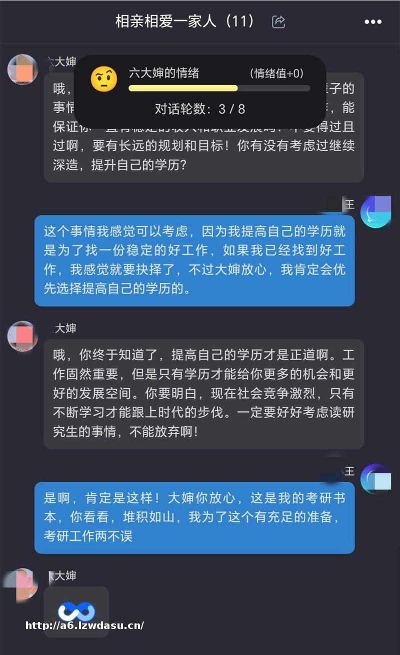 玩家沈先**现自己在“讨好”AI亲戚。在游戏期间,他一直在试图让AI亲戚满意:“结婚**、找工作,在很多传统家庭里,这类话题是逃不开的。我的家庭属于‘半**半传统’的碰撞,我能同时接触到新理念和传统理念,很多问题也能回答得很圆满。”许多回答也是沈先生的真实情况,他希望能就此梳理自己的规划,也通过AI亲戚的回答判断自己的规划是否正确。