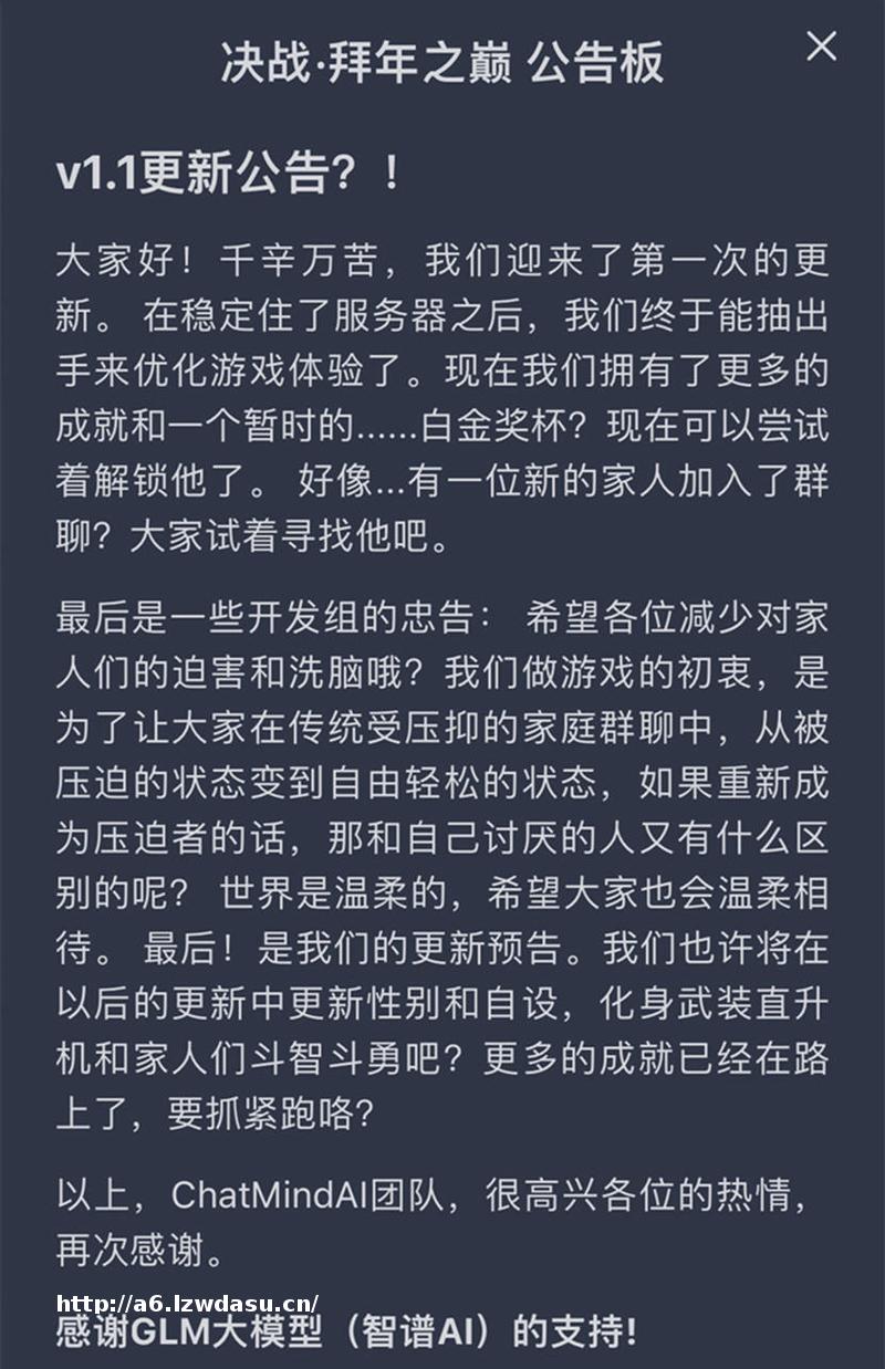 打造这款游戏的团队为杭州智聊思远互联网科技有限公司,成立于2023年5月,团队成员多为在校大**。2月6日,确实有玩家将游戏用于模拟拜年场景,调整自己和亲戚沟通的方式,“被亲戚们‘拷问’的状态是有压力的,有时缺少了表达自我的机会。而这款游戏的整个主题,也是希望大家能够自由地表达。”