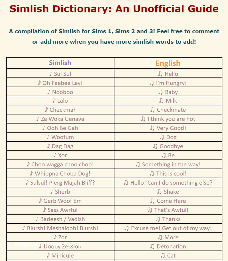 至今,Simlish听起来大约有120个单词,没有字典可以翻译它们,而且可能永远不会有字典,但这并不妨碍粉丝们整理出规律。