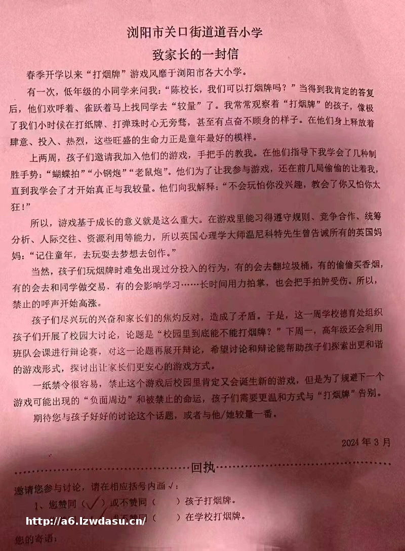 但湖南浏阳的道吾小学不同,校长陈利莎专门写了一封致家长的信,阐述游戏对于孩子成长的重要*,随后又在全校进行了关于“是否打烟牌”的讨论,通过主题班会和辩论,鼓励**们尽情发表自己的看法。