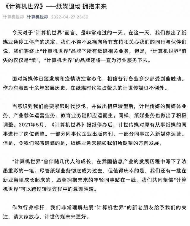 4月2日晚间,创办于1980年的中国**大老牌IT刊物《计算机世界》宣布纸媒业务停工停产,将终止“计算机世界”品牌下所有纸媒相关业务。