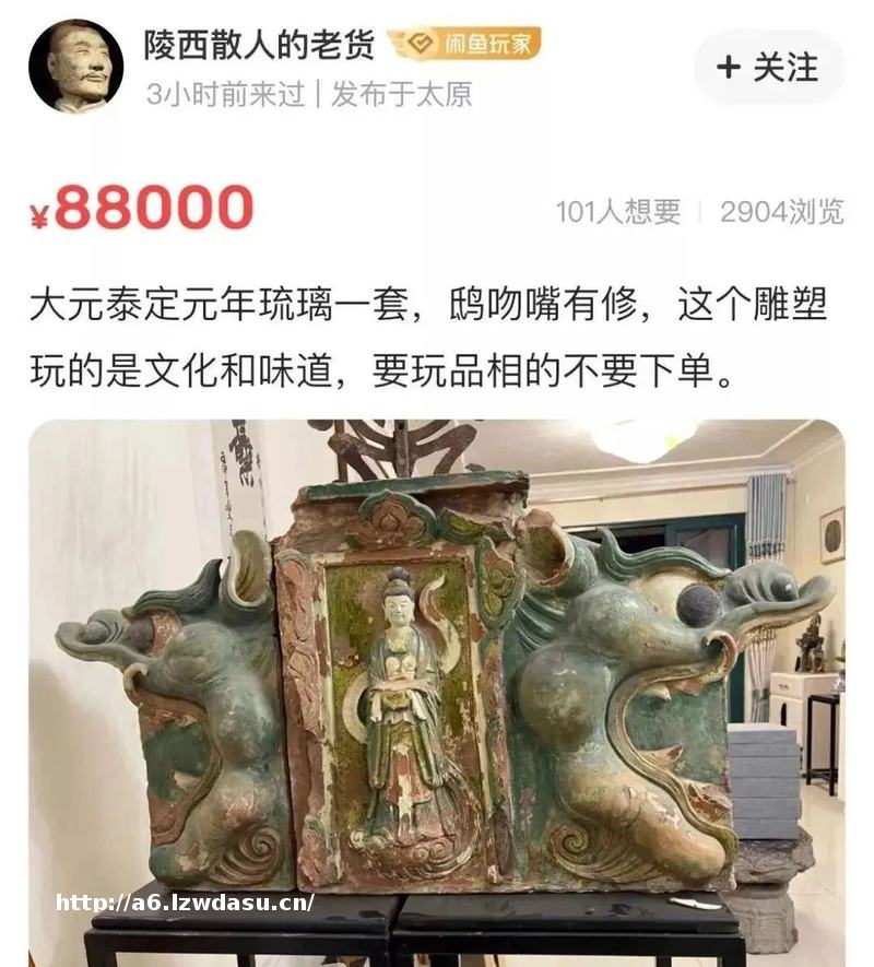 近日,网传一百万粉丝*主在网上公开倒卖文物。疑似被倒卖的文物为一尊琉璃脊饰,存放于**重点文物保护单位山西武乡县北良福源院。涉事*主本人回应,是有人冒用了自己的网名,28日,武乡县有关部门表示,已经追回该文物,****正在进一步处理。(九派新闻)