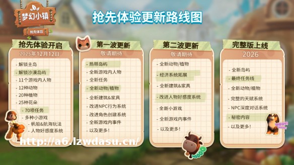 除初步建设村落的功能外,抢先体验版本已开放两座岛屿、11位可培养关系的NPC、12种动物类型、20类可收获作物、25种花卉品种、70个任务、一系列趣味小游戏及航海系统。