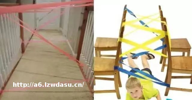 在过道或者椅子之间用胶带搭出蜘蛛网,要求孩子不能碰到胶带从一头到另外一头。这个游戏的好处是,孩子可以往下爬,也可以往上跨。