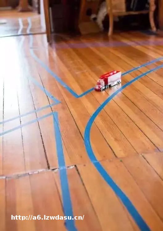 用胶带在家中的地板上设置轨道,孩子们可以拿着车沿着胶带轨道开,可以设置一些不同的站点,比如加油站是旁边放个空瓶,小卖部旁边有一些扮家家的食物,停车场里有几辆不同的汽车模型,站点那里站着几个乐高小人。