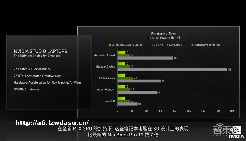NVIDIA也推出了全新的NVIDIA Studio设计本,在全新RTX GPU加持下,这些笔记本电脑在3D设计上的表现比最新的MacBook Pro 16快了7倍。