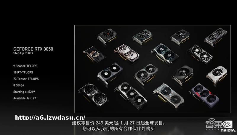 RTX 3050配备8GB的G6显存,建议零售价249美元起,2月26日起全球发售。