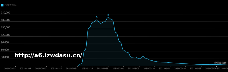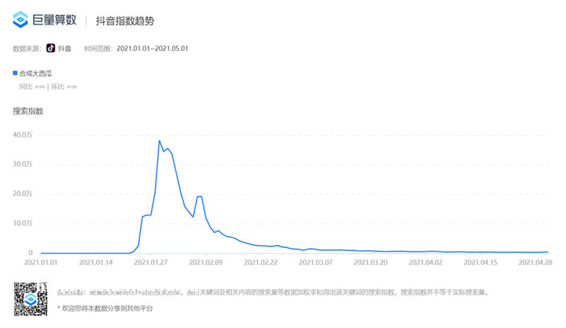 百度指数上,曲线的两个波峰分别对应着2月22日财经媒体对这题游戏爆红现象的报道和解析,以及3月2日,合成大西瓜“**”的话题。