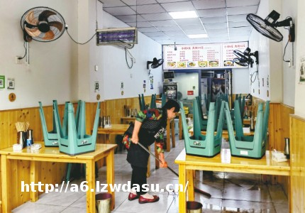 67岁的童母在面馆打扫卫生。