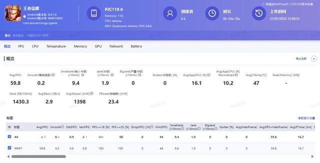 在《蛋仔派对》的“高帧率-高分辨率-高清”画质下,OPPO K11能够在10分钟的游戏中,平均帧率达到了59.9fps,并保持了非常稳定的游戏全程帧率。稳定*方面,稳帧指数仅为0.2。
