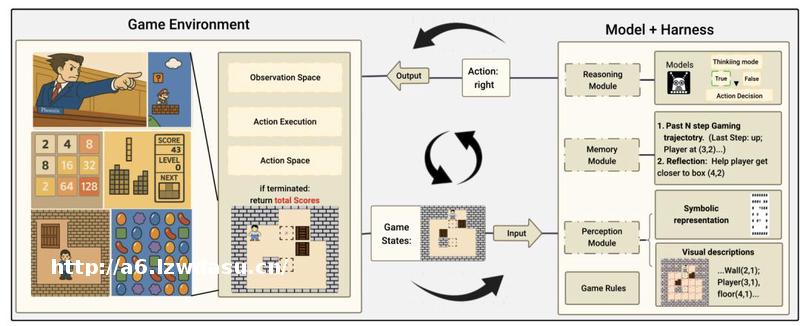 测试过程中通过一种迭代交互循环模式进行,游戏环境会持续地向大模型提供游戏状态,这些动作随后在游戏环境中被执行,接着游戏状态会更新以进行下一轮决策。