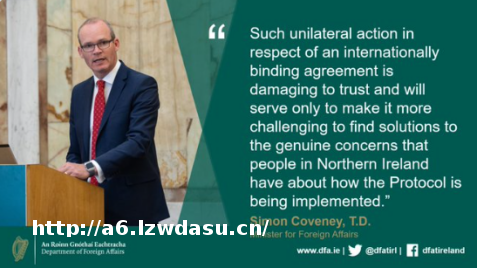该**中另外一个重要的参与方爱尔兰的态度也非常明确,爱尔兰外交部长西蒙·科文尼当天称,对英国准备引入立法的决定感到非常遗憾,针对国际协议的单边行动破坏了信任,这只会使解决北爱尔兰民众的关切变得更加困难。