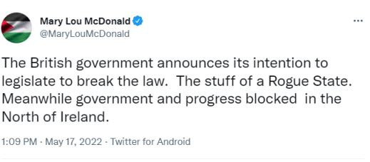 方案公布后,北爱尔兰新芬***人麦克唐纳在其社交媒体平台上**时间表示,英国准备用“立法”来“违法”。