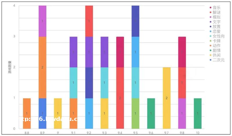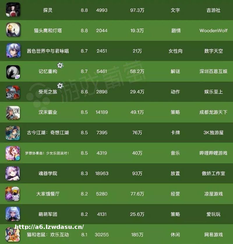 光看词云图还不太明显,所以葡萄君统计了各类型游戏的数量,发现恋爱模拟与偶像养成这种女*向手游,在 Top 30 中占了五款(《旅行串串》最初定位也是女*向手游,把它也算上的话,那就是6款)。它们的评分还非常高,都在9.0分以上,像雷霆的《人偶馆绮幻夜》甚至达到了9.5分。