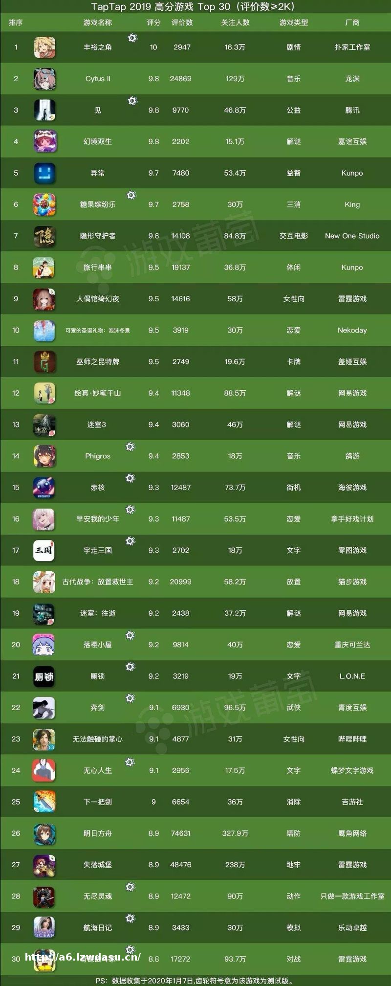 上榜游戏来自于2019年,在 TapTap 平台上进行公测或是开放游戏*测试的产品。几十人评出的满分作品是没有说服力的,所以为了强调评分的有效*,葡萄君设下门槛,除了要满足高分条件之外,参评人数不得低于2000 人,