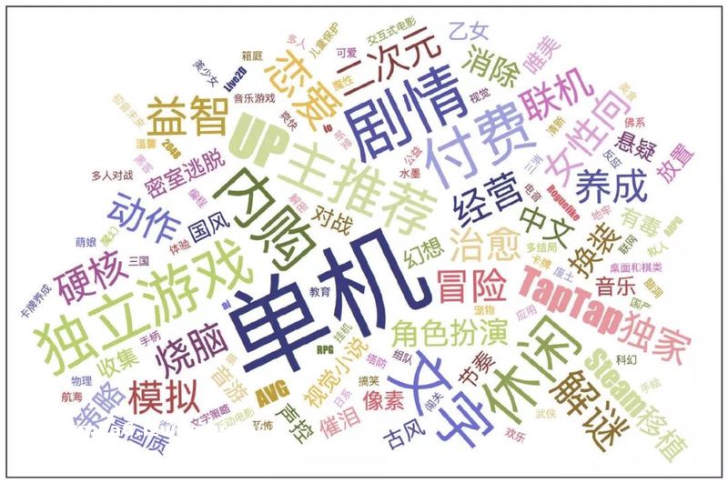 我们提取了去年30款游戏的 TapTap 标签,由此形成的词云图,显示着高分游戏的整体面貌。那些状态突出的标签,真的是我们再*悉不过的好评流向。