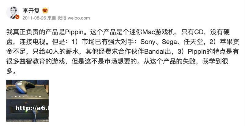 在售出 4.2 万台后,Pippin 于 1997 年草草收场,乔布斯回归之后砍掉了这个项目。2011 年李开复在微*透露,自己正是当年 Pippin 项目的负责人。