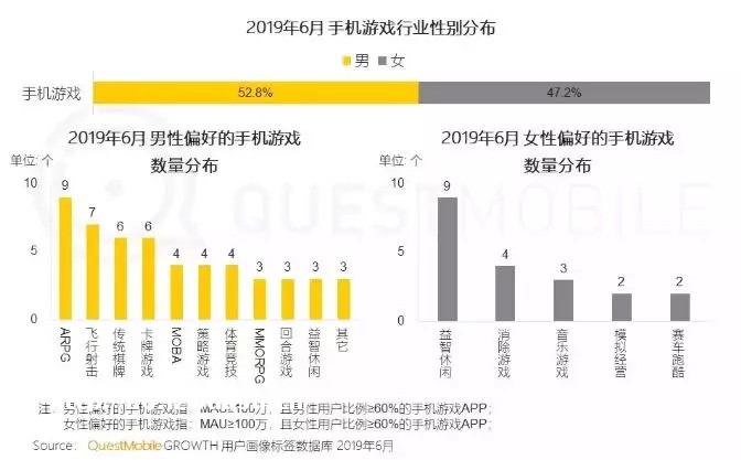 过去很长一段时间,游戏市场都是以男*向游戏为主导,但随着手机的普及以及新生代的加入,女*玩家的占比正在快速上升。截至2019年4月,行业中女*玩家占比已经达到47.2%。