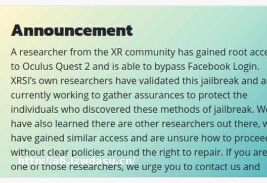 “XR社区的一位研究人员已经获得了Oculus Quest 2的根用户访问权限,并且能够绕过Facebook账号登录。XRSI的研究人员已经验证了这一**行为,并正在努力采取各种措施以保护发现**方法的个人。我们同时了解到,有其他研究人员获得了类似的访问权限,但不确定在没有关于Right to Repair(维修权)的明确条例下应如何行动。如果你是这些研究人员之一,请通过info@ 510-990-4438联系XR Safety Initiative XRSI。”