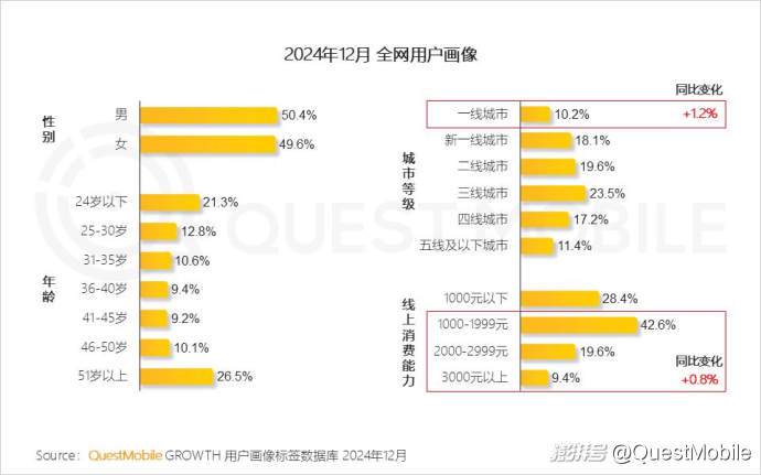 1.3 在就业压力大的背景下,人们涌向就业机会与资源更加丰富的一线城市,其活跃占比同比提升1.2%;线上线下的价格差距持续缩小,部分消费者回归线下购物,用户线上消费能力仅有小幅增长