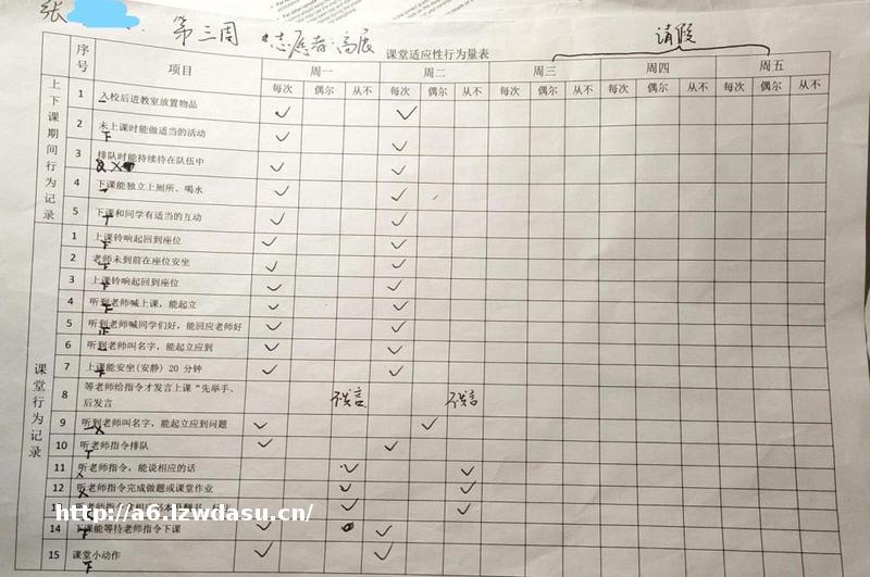 确保**集中注意力上课,帮助**建立常规意识,培养**平稳适应新学校环境的适应和**,培养**自我控制能力,增加自信,帮助**掌握知识和必要社交技能等。此外,实践团队还以课堂适应行为量表和ABC观察记录表的形式对**入学适应条件进行了记录和评定。
