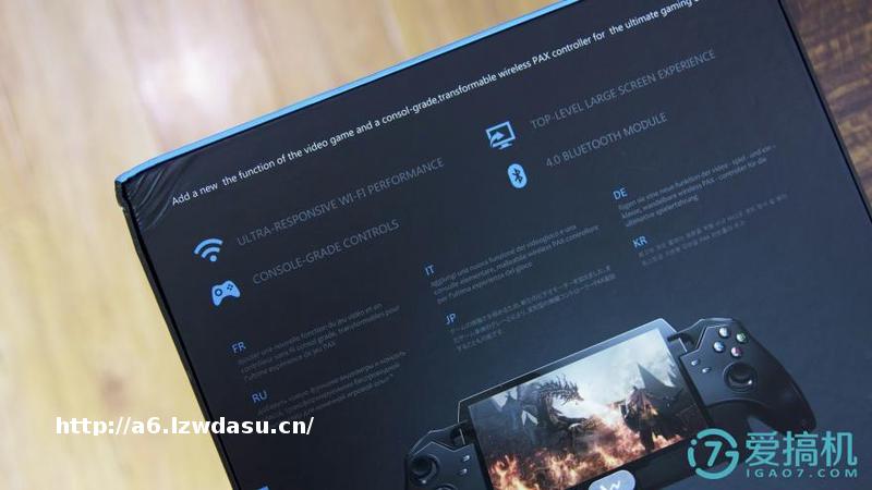盒子本身没有太多可提的,走的是*客风:黑色大底、蓝色点缀,正面印有产品渲染图,背面用不同**语言介绍了WINK PAX主要特点,似乎预示着这款游戏平板还将迈出国门,走向海外市场?
