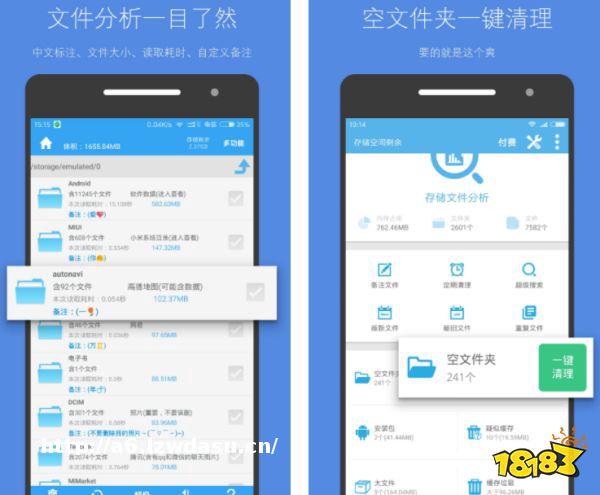 这个软件可以帮助用户打开手机储存文件夹,一键清理空白文件夹,搜索重复文件进行处理,并且能够对个别文件与文件夹进行重命名、备注,避免软件误删重要文件,很多功能都很方便。