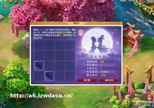 在本次七夕活动中,通过参加环任务或前往“一线牵”处进行购买的方式可得到“喜鹊翎毛”,如果大家想获得更高级的翎毛,那么便可参与“喜鹊翎毛”的合成玩法。游戏内,当大家拥有足够多的蓝色“喜鹊翎毛”后,可以在16格的合成栏内不断移动数字“2”的蓝色“喜鹊翎毛”,以此来合成**为“2048”的七彩翎毛。不过值得注意的是,当翎毛填满16格无法再次移动或数字“2”的蓝色“喜鹊翎毛”耗尽时,游戏会直接结束,届时大家只能得到合成的***翎毛,而其余翎毛则会折算成代表数字“2”的蓝色“喜鹊翎毛”返还给大家。