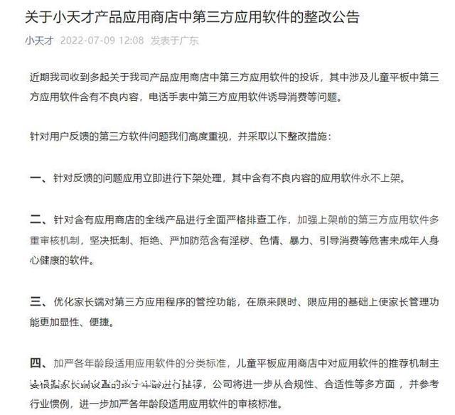 对此,小天才方面回应称,将优化家长端对第三方应用程序的管控功能,含有不良内容的应用软件永不上架。