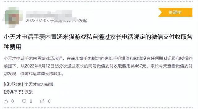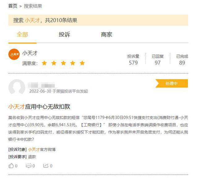 无*有偶,在黑猫**平台输入“小天才”关键词,截至7月14日12时,共显示超过两千条**信息,**内容不乏随意扣款等。