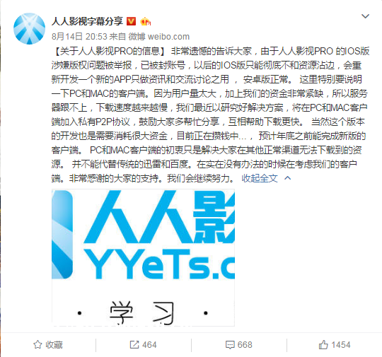 此后,人人**便一直处在关闭网站的状态,直到2015年在官微上宣布转型后,人人**字幕组将会移至人人美剧,才再一次出现在大众的视野中。