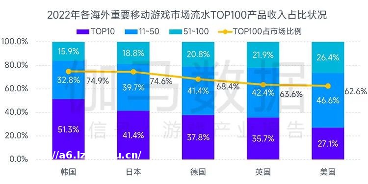 在海外市场,美、日、韩、英、德五国仍是全球移动游戏市场的重要组成部分,全球移动游戏营收中超五成来自于这五国市场。受不同的地域文化、用户习惯、市场发展进程等因素影响,各国市场展现出了不同的特征。从流水***100游戏收入占比来看,韩国与**相比其他海外其他市场具备更高的集中度,其中韩国***10游戏收入占***100产品总收入的五成以上。