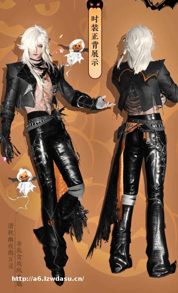 男款【幻夜纵歌】颜值同样出彩,剪裁狂野大气,短款皮质外套搭修身皮裤,硬朗金属链条和蛛网黑纱显得帅气酷哥更加野*不羁。而身前背后的橘色线条与小南瓜元素,又为硬汉增添了几分活泼气质,反差感绝了,穿上**是宴会派对上的视觉焦点。