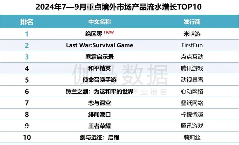 2024年4—7月重点境外市场产品流水增长***10中,新品《绝区零》获得**。