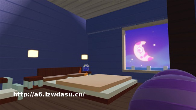 起居室的设计以藏蓝色为背景,**简约的家具简单陈设。原木风格的双人大床温馨十足,床头柜还摆放着星星小夜灯装饰,流淌着夜晚的静谧色彩。透过偌大的窗户向外眺望,梦幻的蓝紫色夜空与奇特的残月尽收眼底。它们收听到每位**者的心声,为大家送去好眠的安抚。