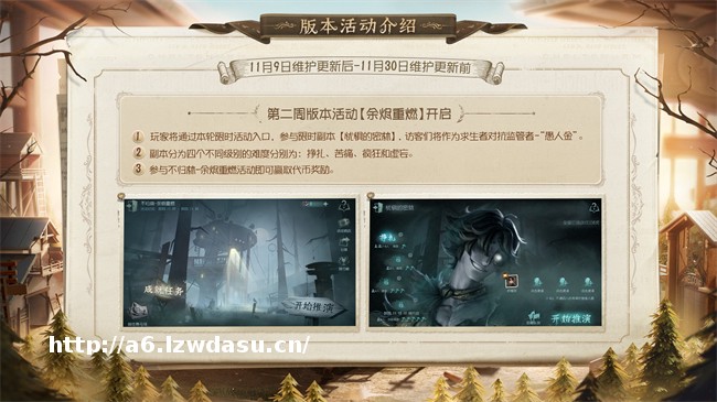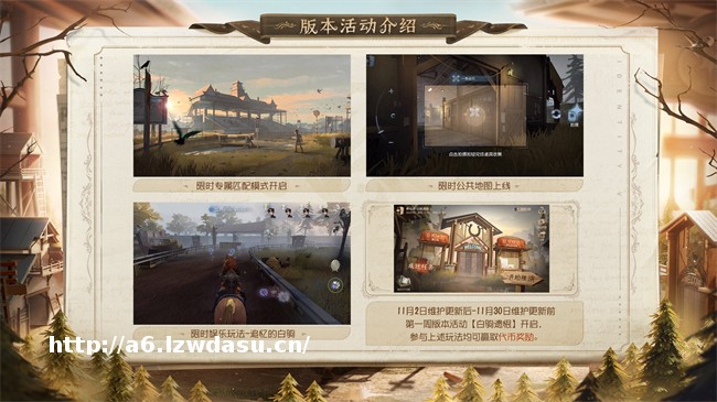 现在出发,追上过去的自己,了结往日的遗憾!随着11月1日版本维护更新,《第五人格》将开启**周版本活动【白驹遗恨】。全新战斗地图-克雷伯格**场上线。专属匹配模式和限时**玩法-追忆的白驹等待各位访客前来参与,同时克雷伯格**场公共地图也将同步开启。