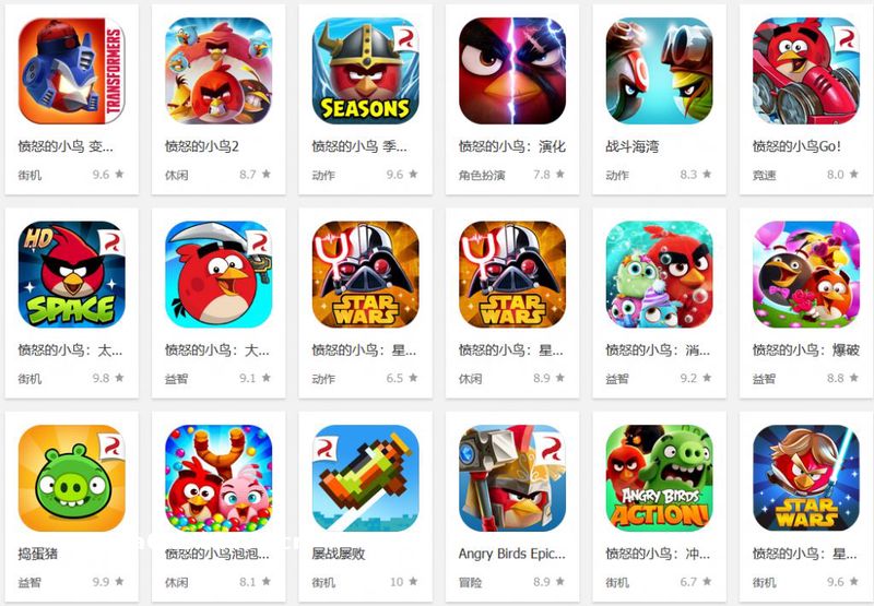Rovio在《愤怒的小鸟》获得成功之初,曾趁热打铁推出过多个版本的“愤怒的小鸟”。在App Store搜索开发商Rovio出现了一个让人瞠目结舌的结果——他们曾上架42款游戏,尽数与“愤怒的小鸟”这一IP有关!然而在中国区,其中21款已经**了。