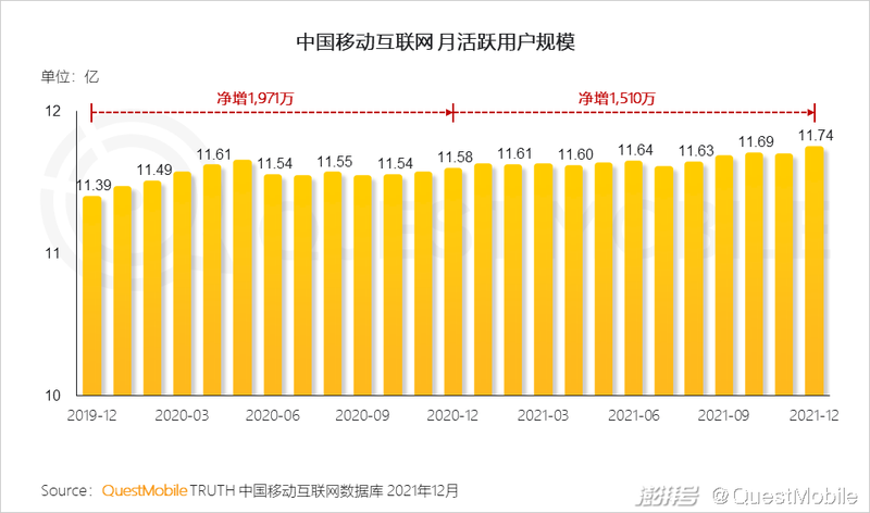 1.1 移动互联网覆盖整体趋于饱和下,用户规模依然保持小幅增长,截至2021年11月,全网用户再次达到11.74亿新高