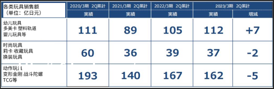 虽然没有具体的TCG销售额,但可以看到,包括TCG在内的动作玩具销售额正在从**的打击中回复过来,2023年5月期二季度(也是近半年)动作玩具销售额**为162亿日元,同比下降5亿日元。