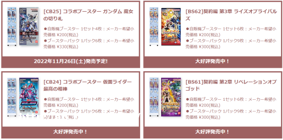 《Battle Spirits(战斗之魂)》方面,万代举办“Battle Spirits冠军赛2022”,预选赛从11月开始持续到12月,预定4月举办决赛。推出了《假面骑士》《机动战士高达》《龙与虎》《EVA》《契约篇》等多款新卡包.