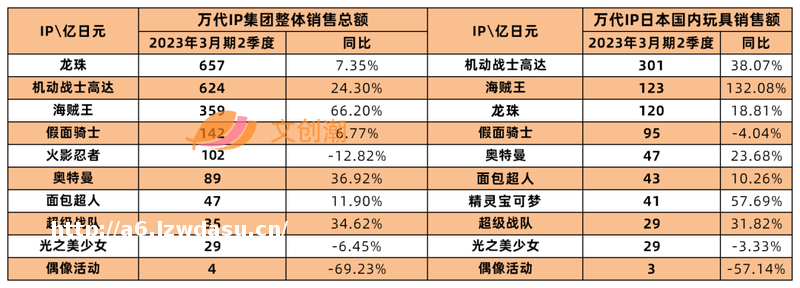 从上图万代各IP的集团整体销售额及**国内玩具销售额来看,《海贼王》均涨幅**,该IP整体销售额359亿日元,同比增长66.2%,《海贼王》**国内玩具销售额123亿日元,同比大幅增长132.08%。